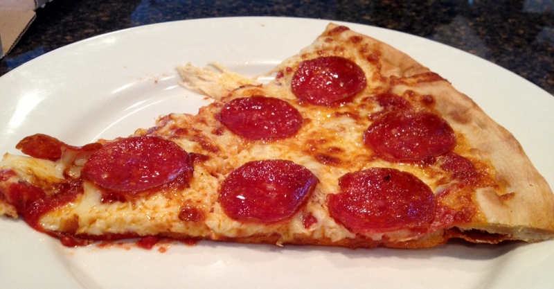 Then came the conveyor oven. I tell ya, I’m just not a fan of conveyor ovens. You can sprinkle all of the magic on top of the dough that you want, but if that pizza isn’t cooked on a hot stone you end up with a crust that is missing that charred, slightly crispy bottom. The final product here was a crust that while very chewy, a bit dense, and folded nicely, was a little moist and soggy underneath. Now to be fair, the short trip in the cardboard box certainly doesn’t help in that department. I’d venture to say that the pizza, if eaten in house, would be better. The sauce was pretty standard, sweet and tasty and plenty of it. The same can be said for the cheese, which was generous as well.
